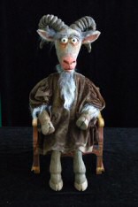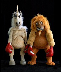 Voici les marionnettes de tous ces personnages enfin entièrement réalisées et qui n’attendent plus que leurs costumes respectifs : pour le Bouc, une pélerine de grand voyageur de chemins de fer (c’est dans le train qu’Alice fait sa connaissance) ; pour la Licorne et le Lion, de rutilantes culottes de boxeurs (un combat aussi échevelé que fantaisiste les mettra aux prises malgré tous les efforts d’Alice pour les séparer…).