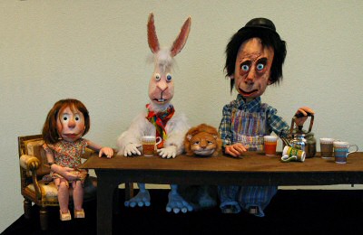 Tiré d’Alice au Pays des Merveilles, nous ne passerons bien entendu pas à côté de ce qui en est sans doute l’épisode le plus célèbre, Le Thé chez les Fous. Voici réunis en un très sage (et donc très trompeur) portrait de famille : le Lièvre de Mars, qui dans notre fable tiendra également le rôle du Lapin blanc ; le Chapelier fou, auquel ne manque plus qu’un impeccable complet londo-nien — à moins que nous ne décidions pour lui d’un habit autrement fantaisiste ; le Loir qui pour le moment, malgré une bouille fort sympathique, n’est qu’une doublure ayant beaucoup plus à voir avec un chat qu’avec un loir ; et enfin Alice elle-même, qui attend avec impatience les nombreux essais de costumes, chaussures, coiffures… auxquels nous ne manquerons pas de la soumettre.