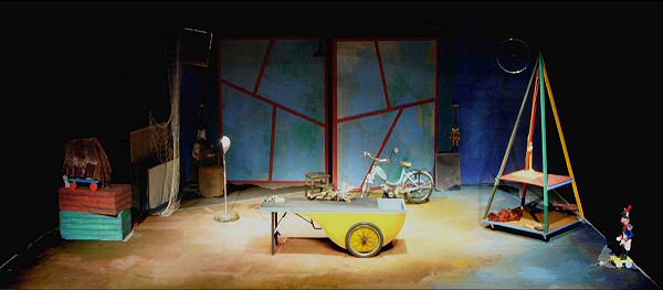 Voici, pour commencer, la photo du décor. Nous vous avions montré de nombreuses images de sa construction dans la précédente gazette, le voici terminé ! Vous reconnaissez au fond (en termes de théâtre on dit : au lointain plateau) la motocyclette qui figure sur l’affiche que nous vous avions dévoilée également dans notre précédente gazette. Au centre, la carriole sur la table de laquelle Stéphanie et Michel, les deux comédiens-marionnettistes (plus besoin de vous les présenter !) manipuleront les marionnettes dans la plupart des scènes. D’autres objets mystérieux y figurent : un punching-ball à gauche de la scène (on dit : à jardin), une sorte de pyramide à droite (on dit : à cour)... Vous découvrirez leur raison d’être, on l’espère, en voyant notre spectacle.