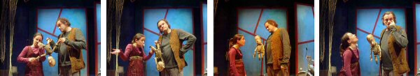 Dans l’épisode illustré par les deux photos ci-dessus, Pinocchio, toujours aussi indocile, revend le livre de lecture que lui a donné le généreux Geppetto au prix de son unique manteau, et s’achète avec les quatre sous récoltés une place pour le Grand Théâtre de Marionnette de l’Illustre Mangefeu. Et voici que Polichinelle et Arlequin (photo de gauche), deux marionnettes à fils, le reconnaissent et lui font signe de les rejoindre... Soudain (photo de droite), Mangefeu le montreur de marionnettes apparaît, furieux de voir que la représentation s’est interrompue, et menace Pinocchio. Comme vous pouvez le voir, Mangefeu est interprété par Michel en personne... ou presque, puisque le corps de Mangefeu est un corps de grande marionnette. Nous vous avions déjà montré cette technique de “semi-marionnette” dans notre deuxième gazette, mais sans le beau costume qu’a conçu pour lui Françoise et que vous découvrez aujourd’hui.